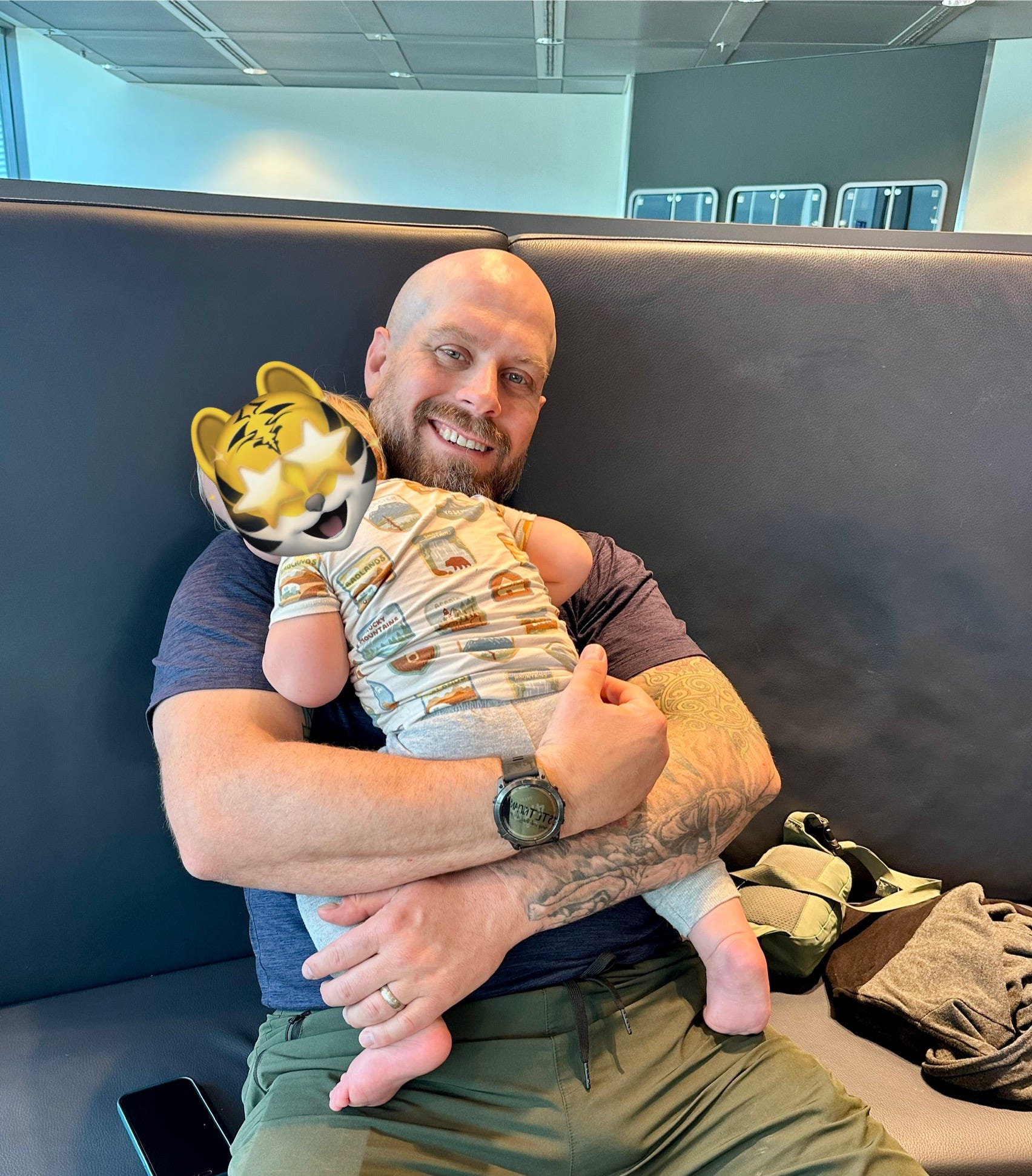 My Garmin watch began to alert me to a rising heart rate. I suddenly became acutely aware of how incredibly hot it had become inside the cabin. I looked at the time—it had been 30 minutes since we boarded, with no sign of takeoff. I opened all three of our air vents and took off my son’s outer layers. If I’m roasting, he definitely is.